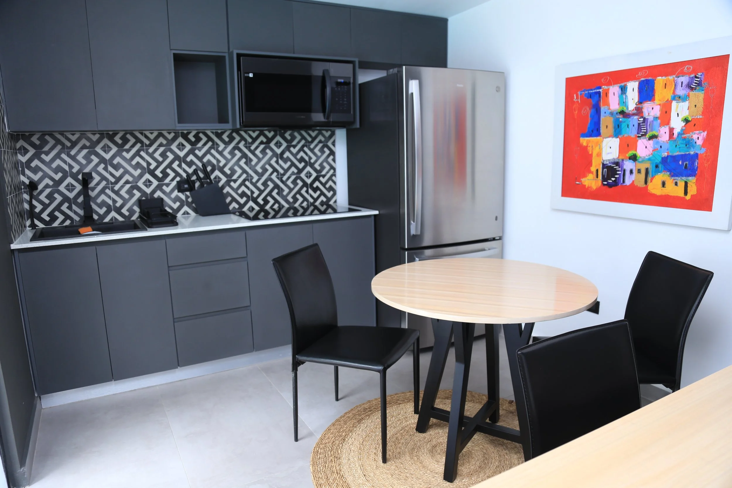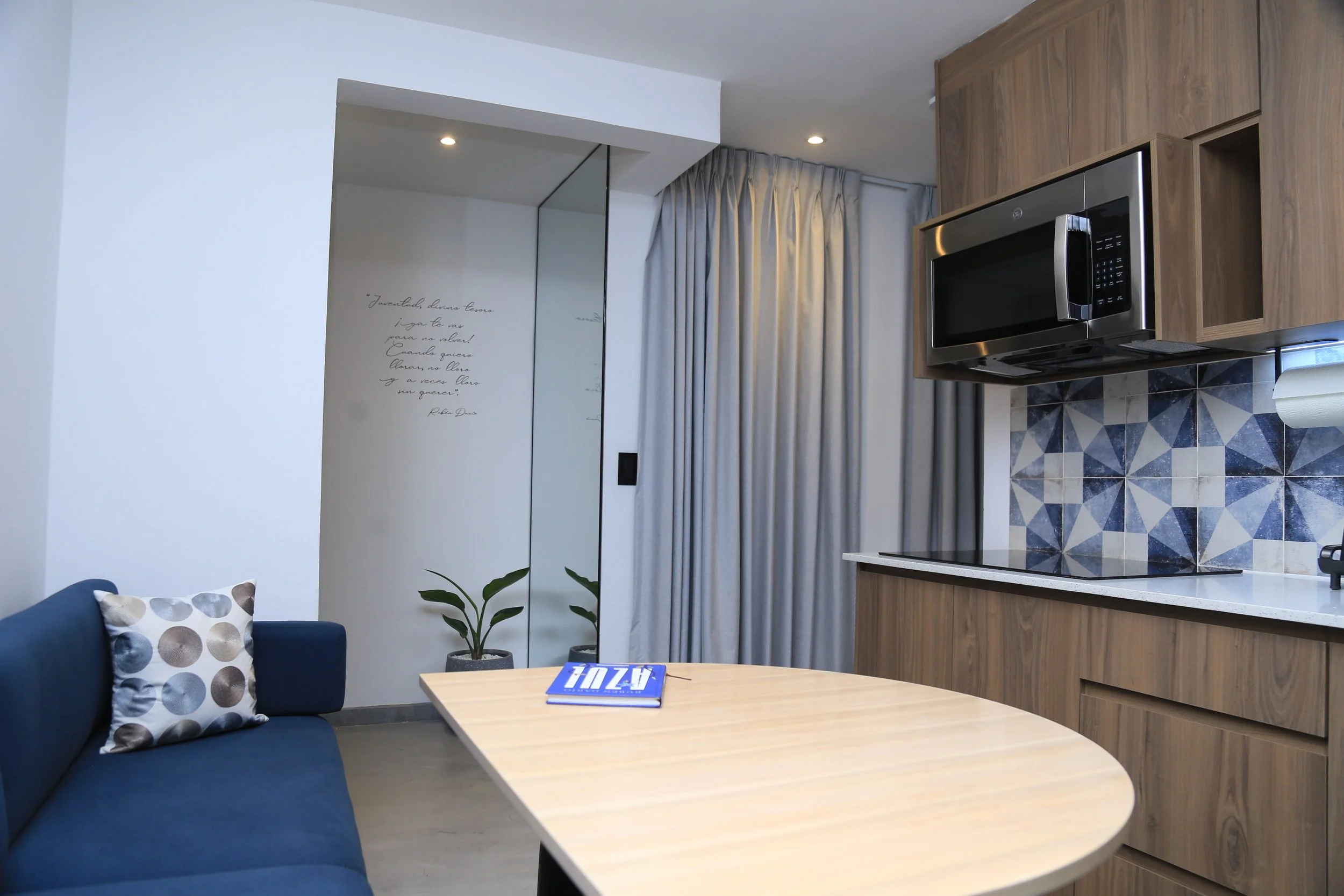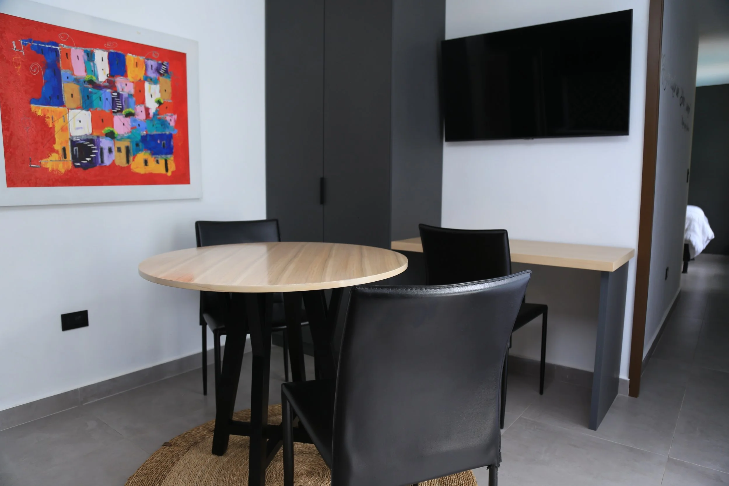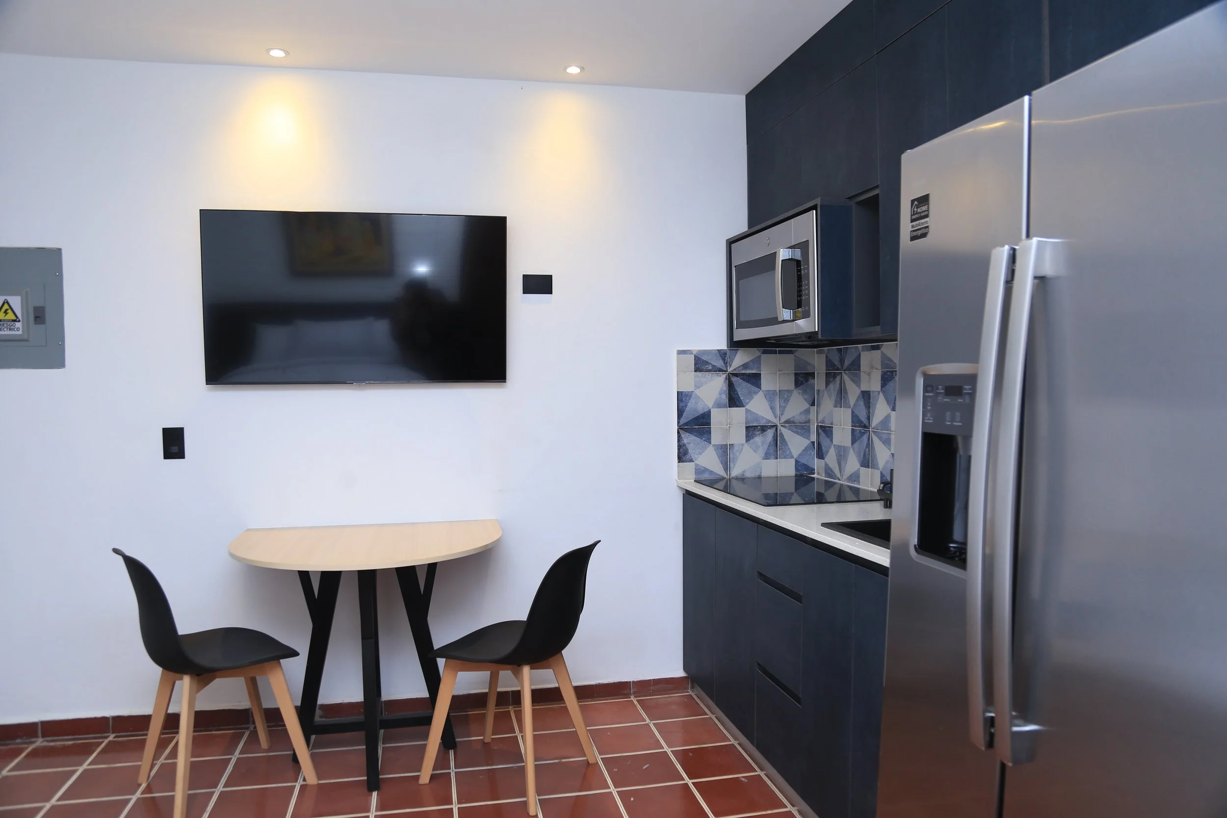 La suite cuenta con cama king, televisión de última generación, aire acondicionado, internet de alta velocidad, ducha con agua caliente, kitchenette totalmente equipada con línea blanca (Refrigeradora, cocina, microondas y cafetera), además con utensilios de cocina como platos, cubiertos y vasos. La suite también cuenta con toallas, sábanas y servicio de limpieza una vez a la semana.