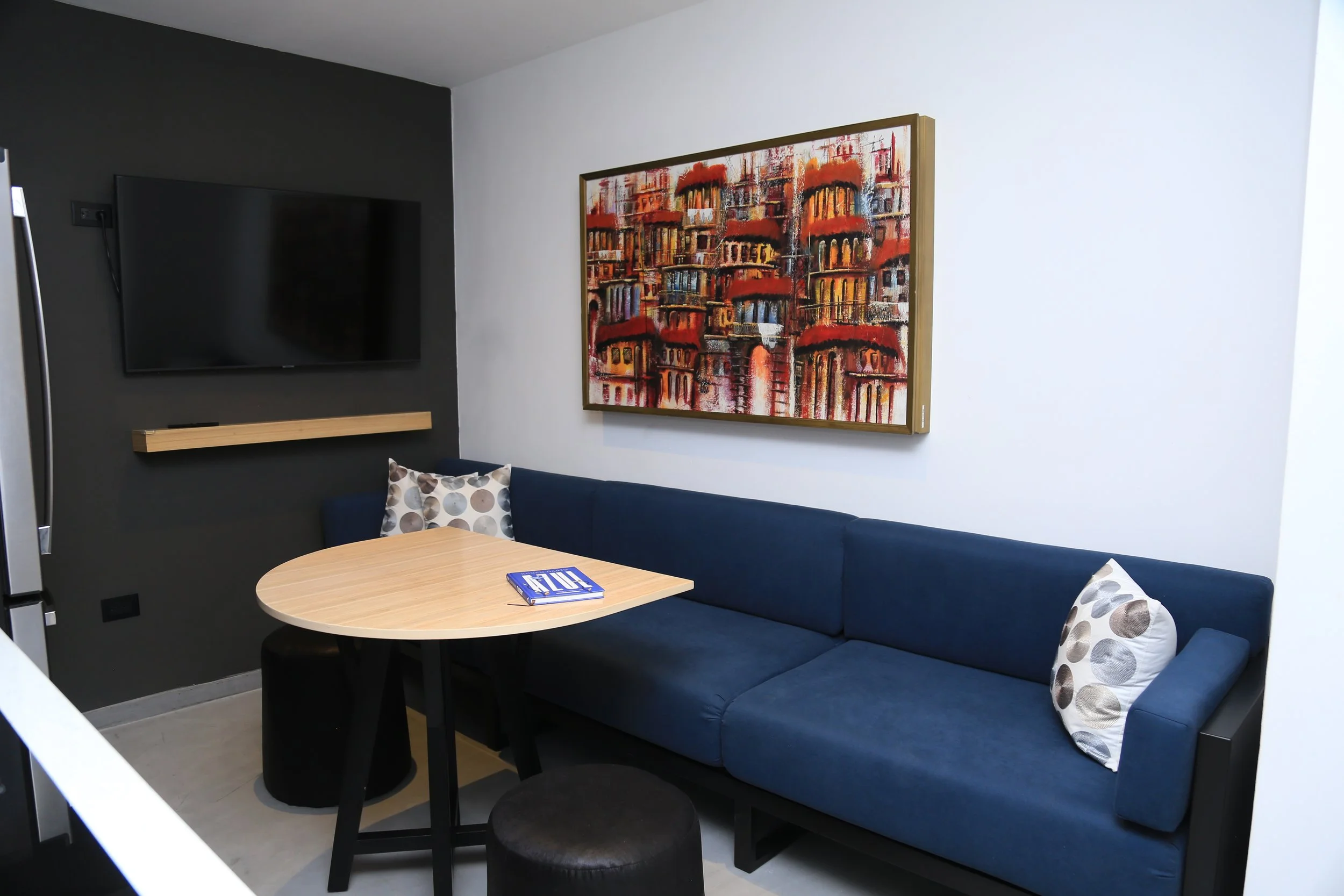 La suite Mario Vargas Llosa, cuenta con 32m2, cuenta con dos habitaciones, espacio de Kitchenette, comedor y baño, enfocada a familias pequeñas o amigos que quieran compartir su espacio de habitación.