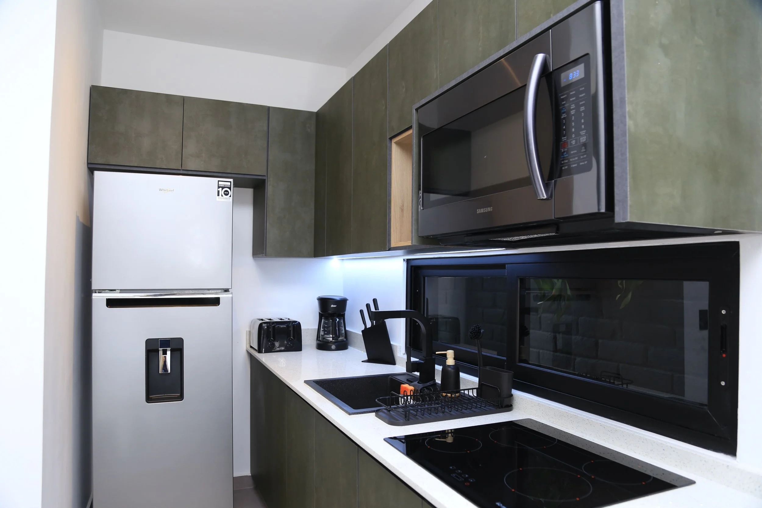 La suite cuenta con cama queen, televisión de última generación, aire acondicionado, internet de alta velocidad, ducha con agua caliente, kitchenette totalmente equipada con línea blanca (Refrigeradora, cocina, microondas y cafetera), además con utensilios de cocina como platos, cubiertos y vasos. La suite también cuenta con toallas, sábanas y servicio de limpieza una vez a la semana.